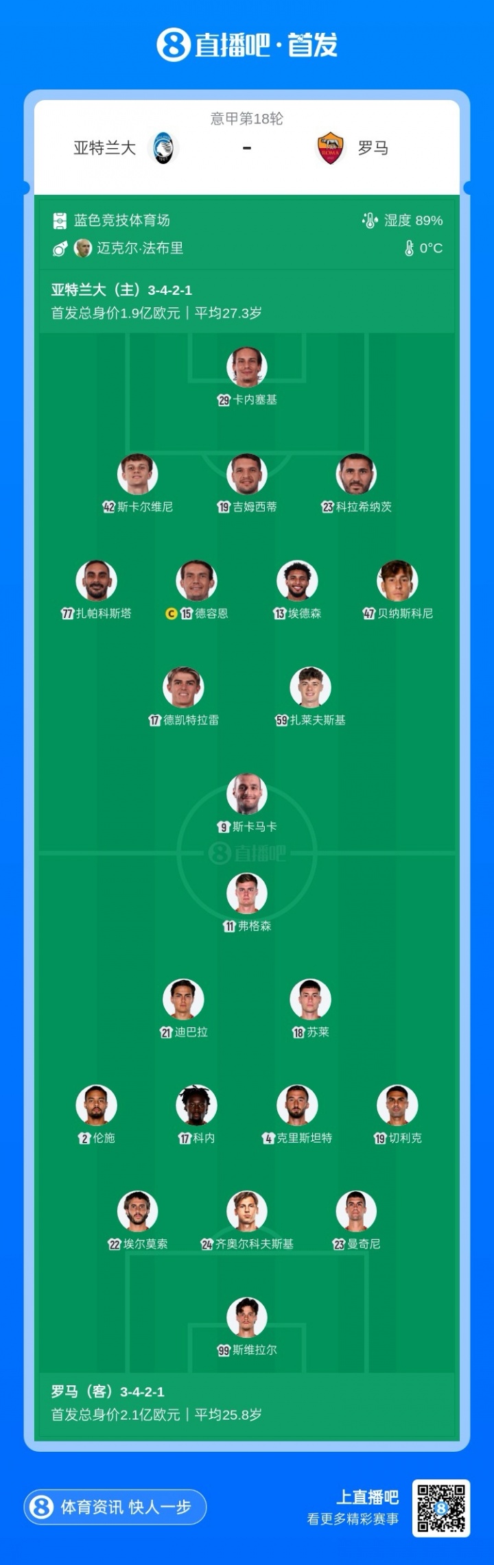 亚特兰大首发:29-卡内塞基、42-斯卡尔维尼、19-吉姆西蒂、23-科拉希纳茨、77-扎帕科斯塔、15-德容恩、13-埃德森、47-贝纳斯科尼、17-德凯特拉雷、59-扎莱夫斯基、9-斯卡马卡
